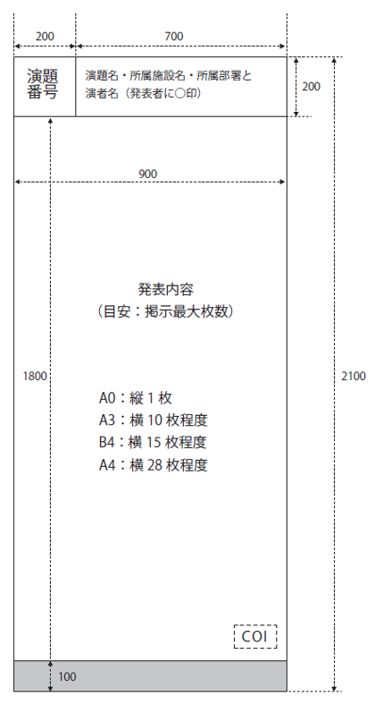 ※下部20~30cm は見づらいために余白(掲示しない)とすることを推奨します。 COI(利益相反)による開示をお願いします。大会ホームページに案内のある仕様で必ず図に示す場所に開示ください。